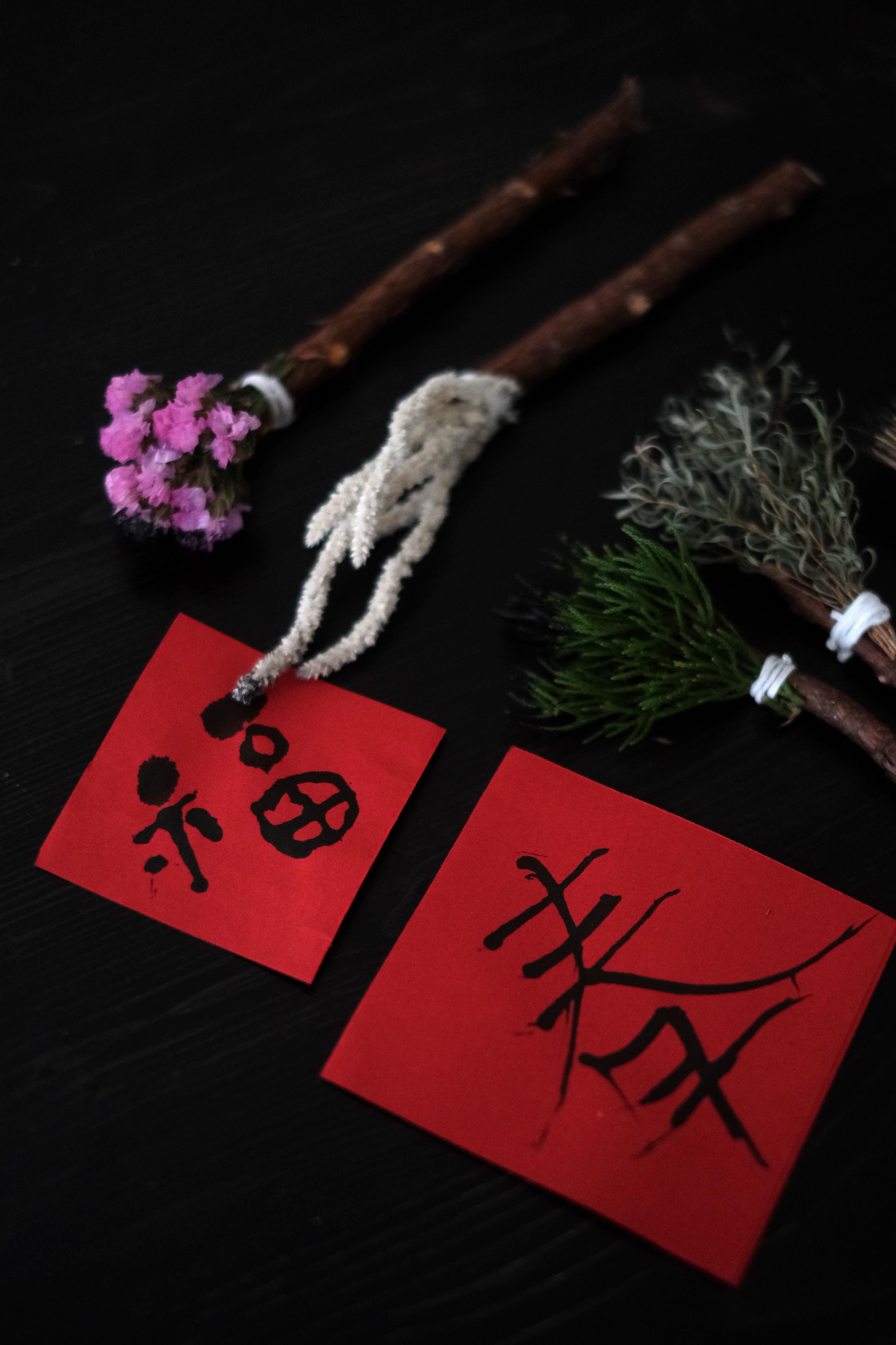 𓆩 複合媒材:銀線、水晶、植物畫春聯