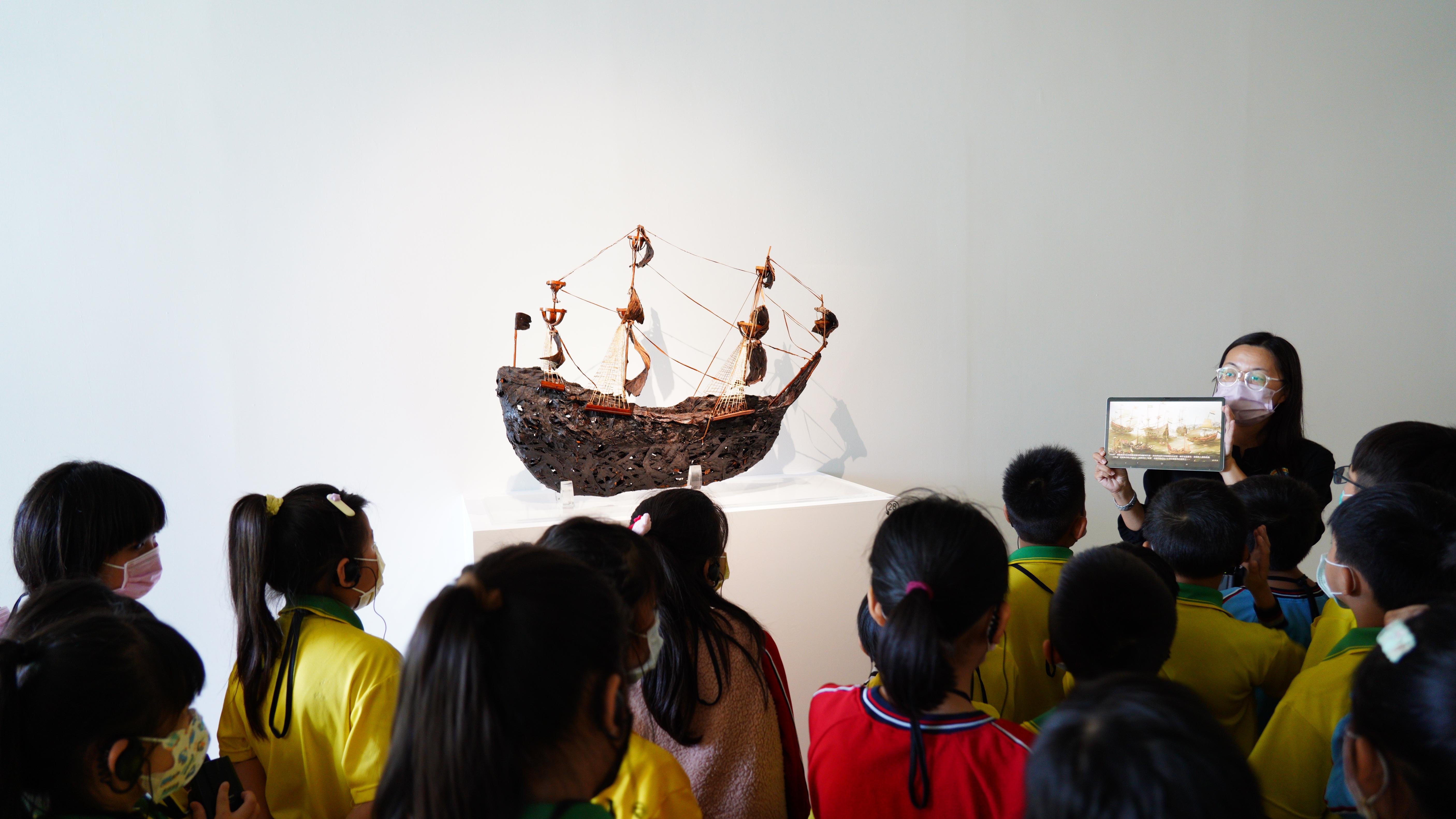 這件作品羅懿君以十七世紀荷蘭東印度公司的商船作為原型,導覽老師準備原始船型的圖像,對比藝術家將竹條作為結構,運用香蕉皮與香蕉絲纖維創作的作品。