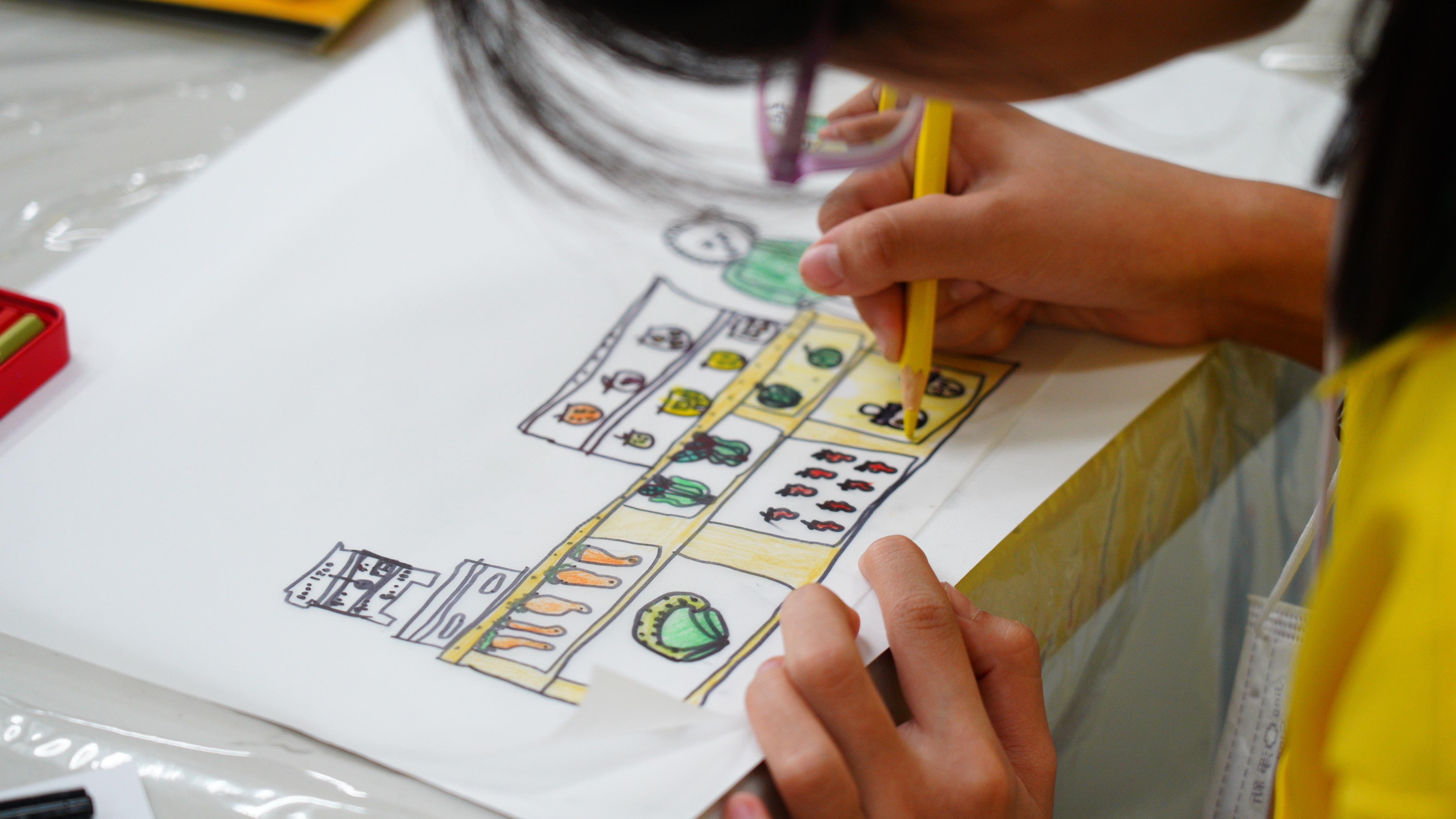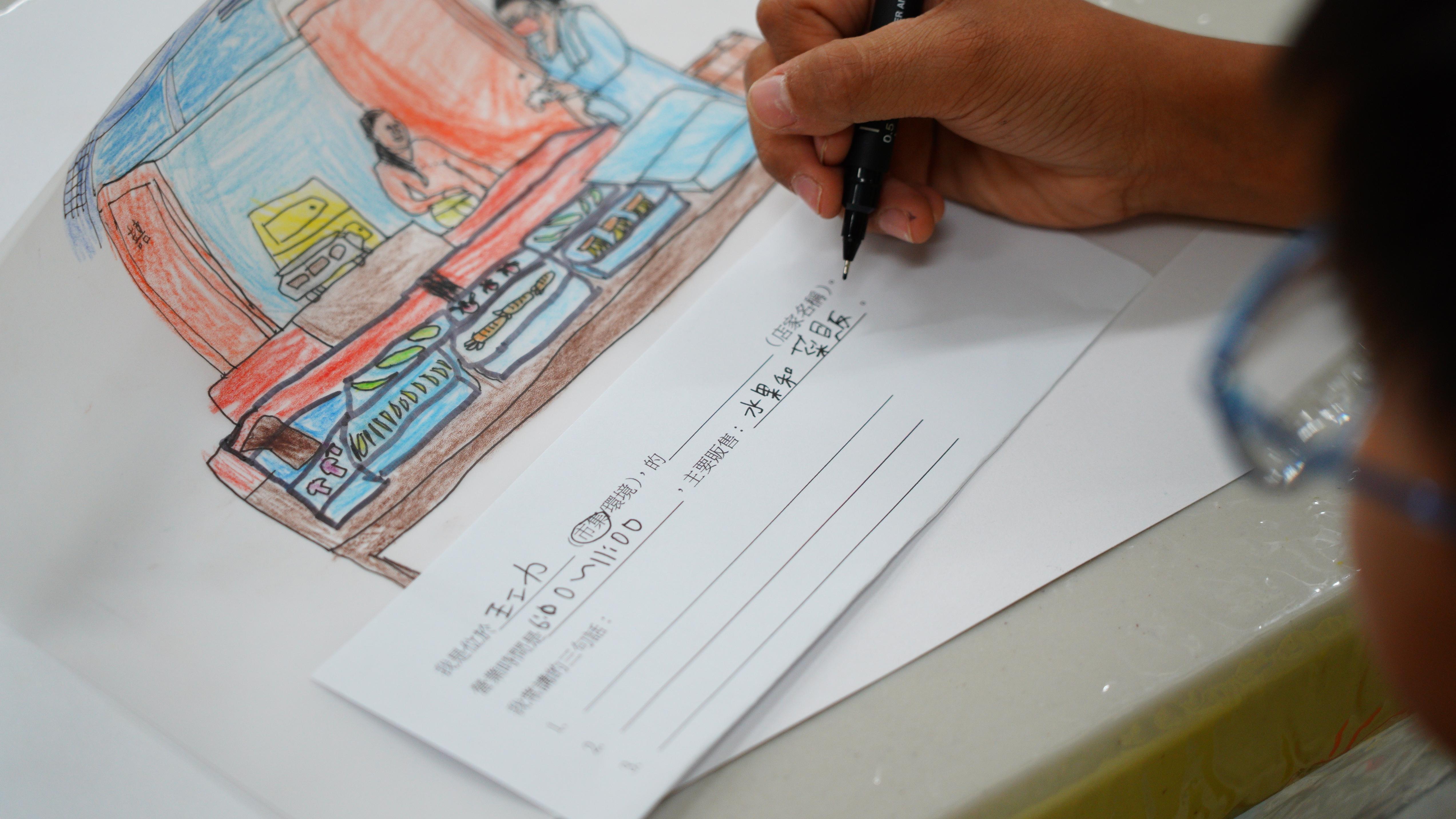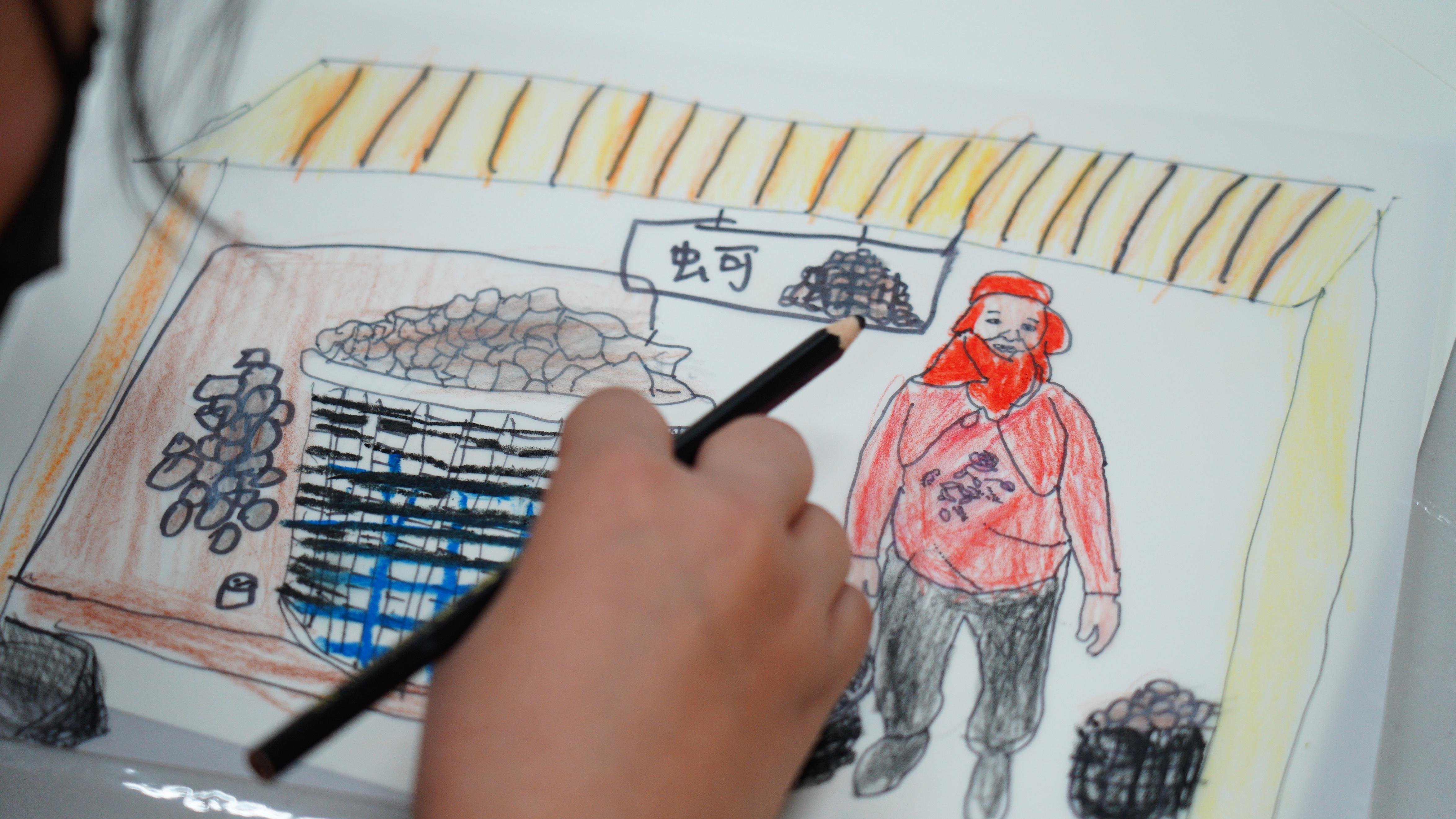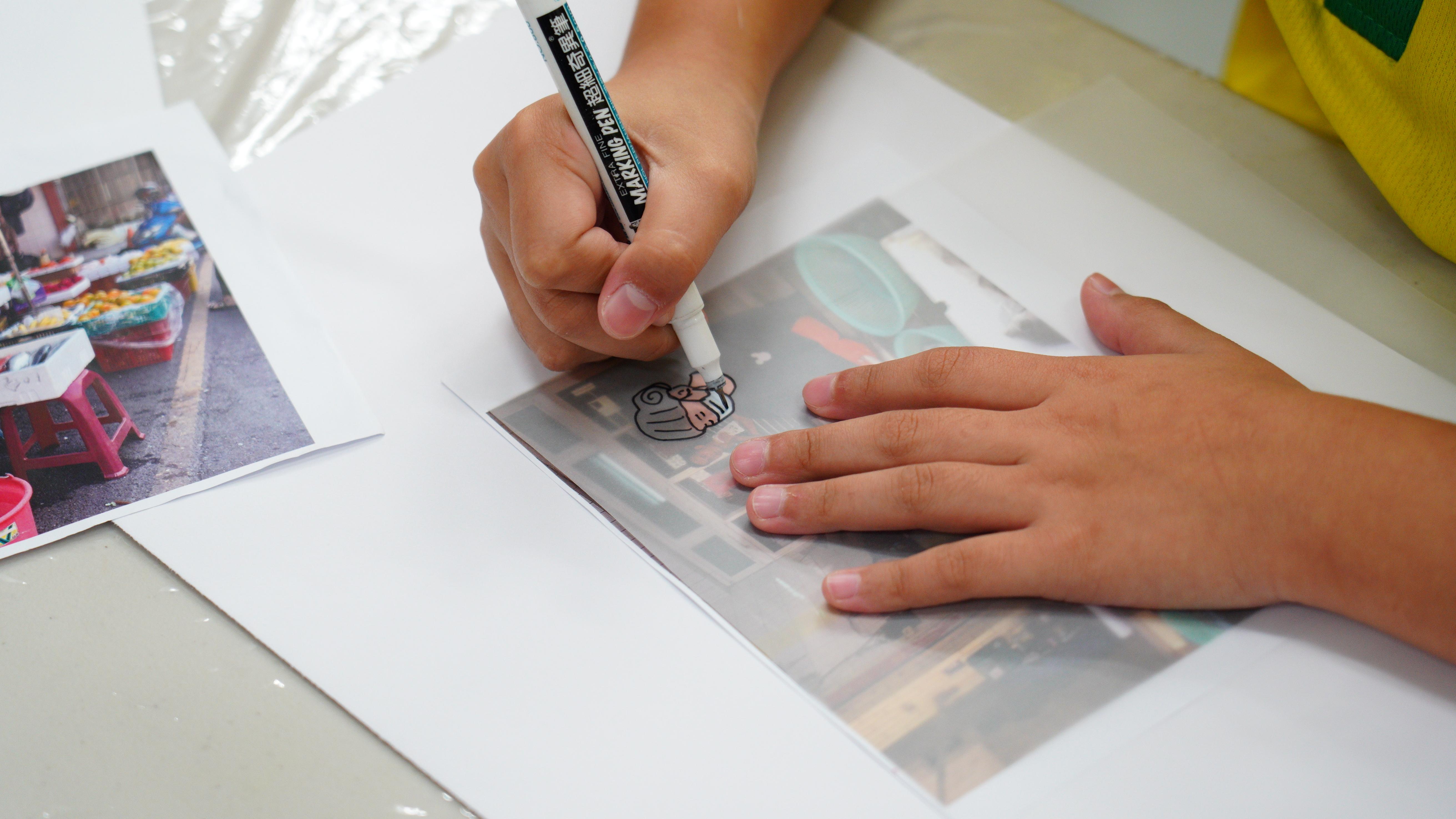 ◇ 下午的創作活動將參考之前的市場觀察經驗,結合當天展覽的欣賞心得,成為他們自己創作的養分。透過描繪圖紙的方式,他們將身邊可見的市集攤商繪製出來。