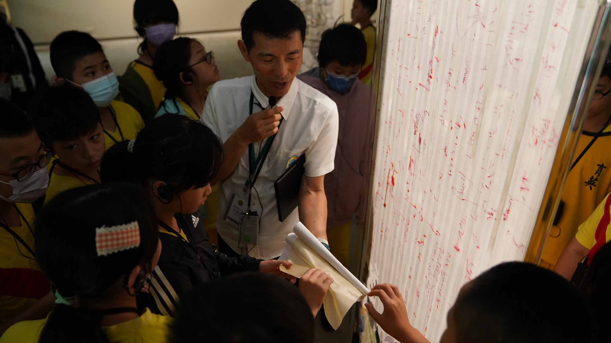 雖然畫在絹本上的作品不能摸,但導覽老師準備了一塊絹布,讓同學可以親自感受不同於紙本的創作底材。