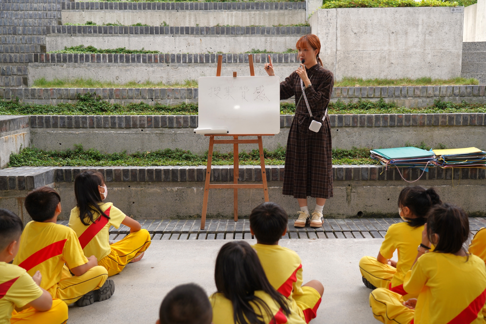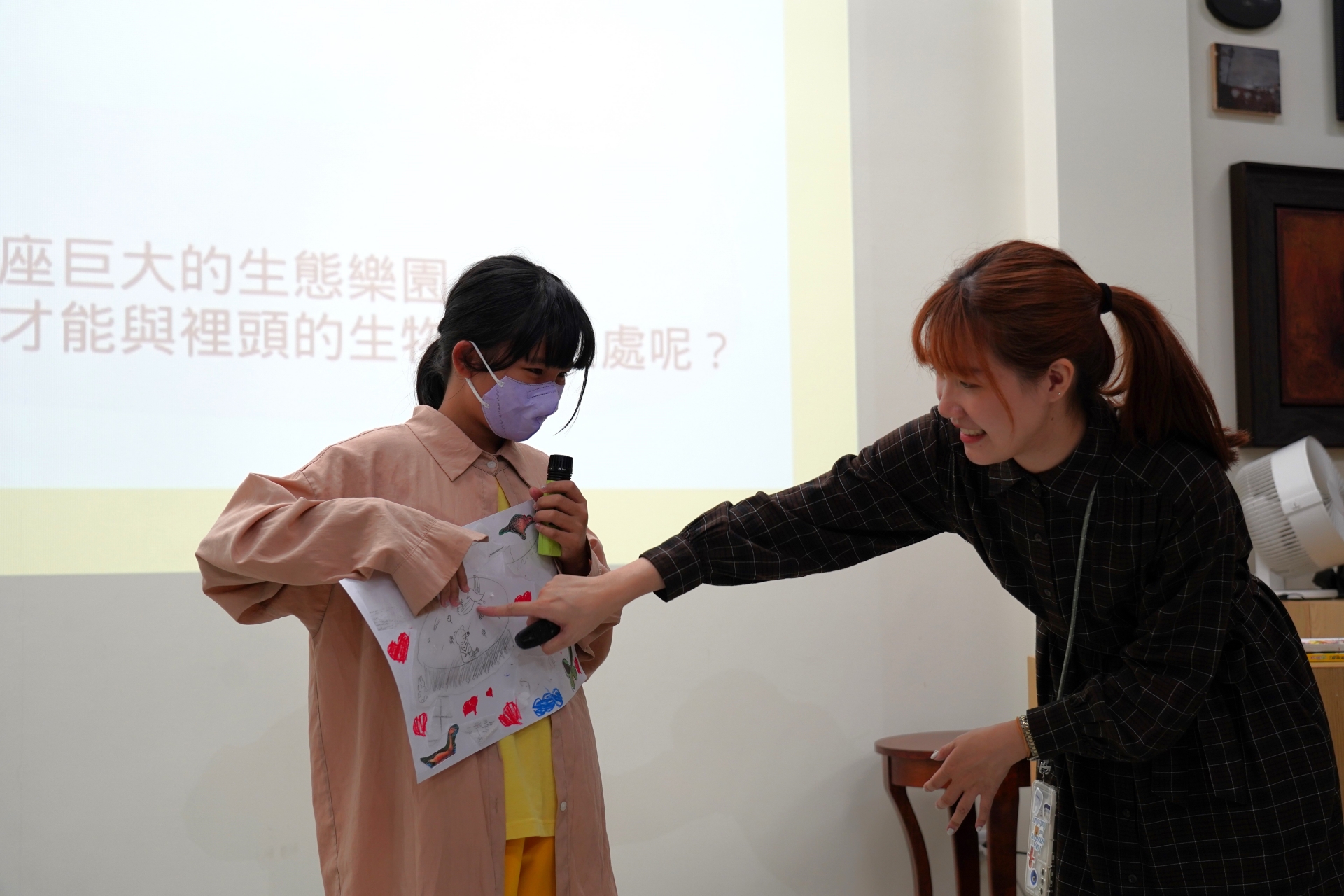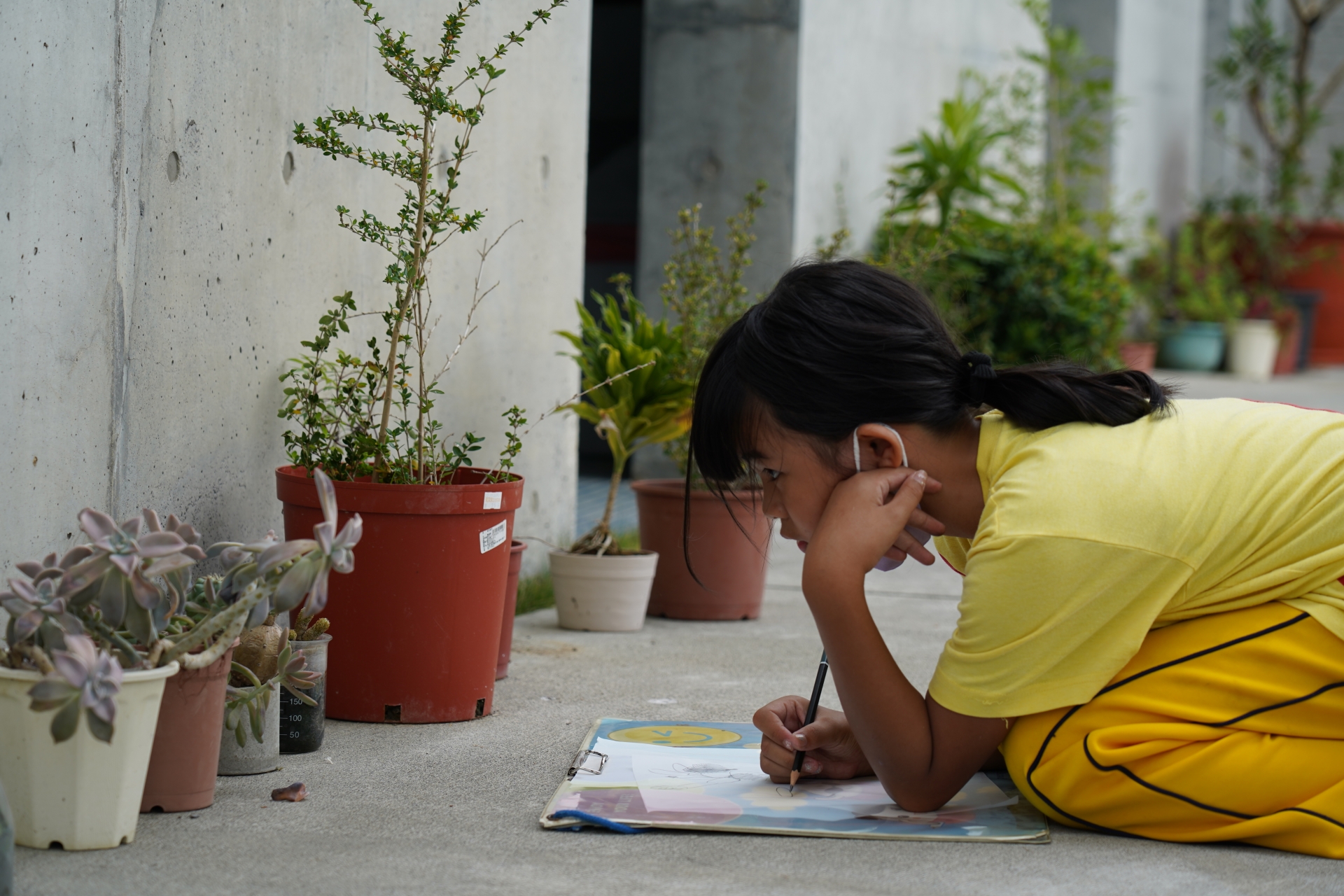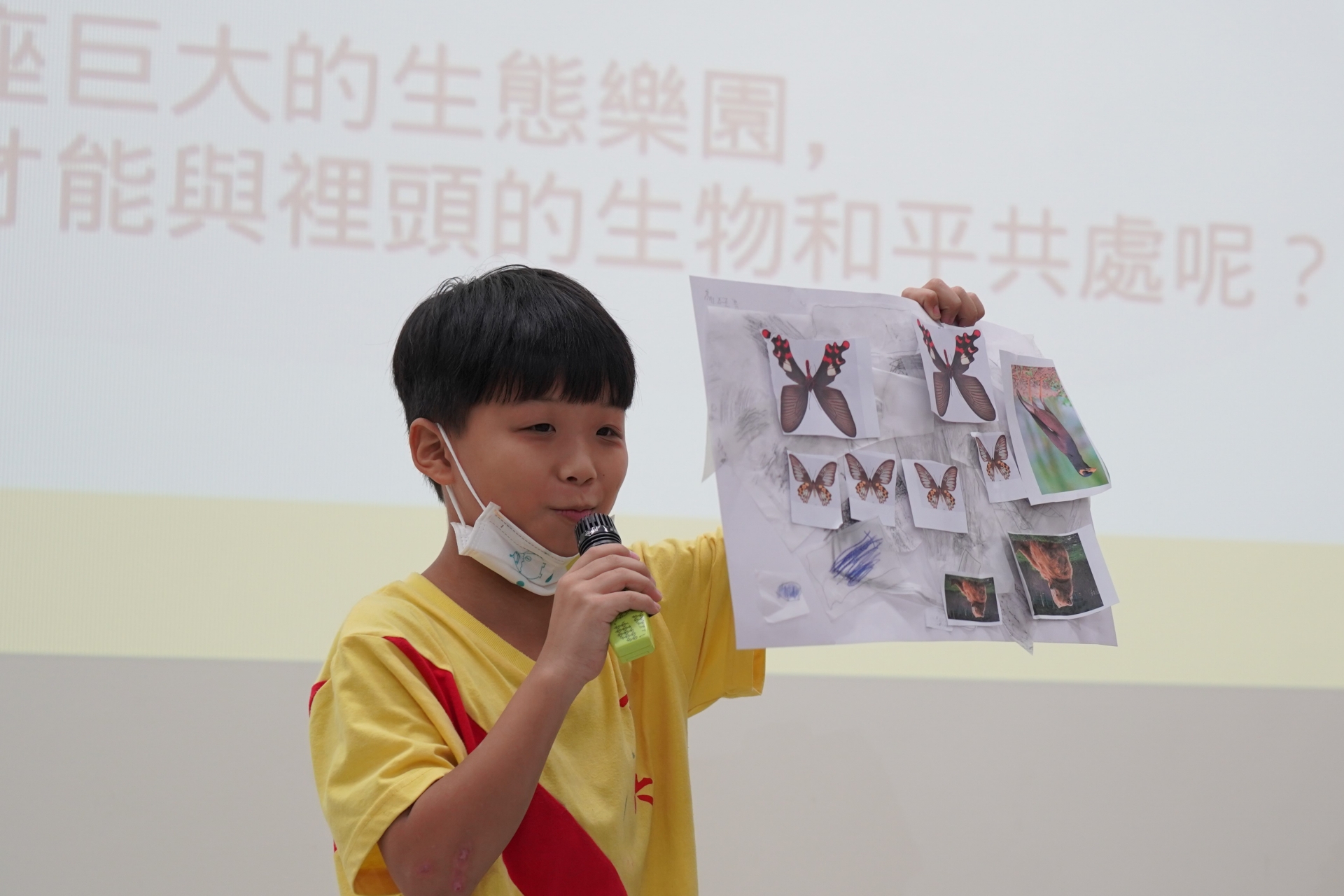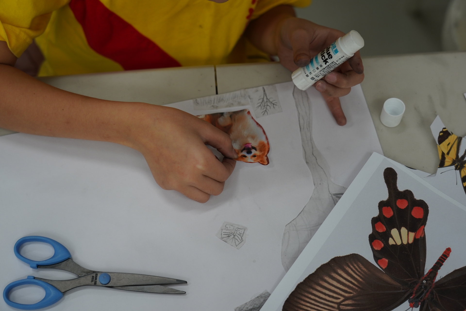 創作課程由林羽婕老師設計,靈感源自展覽中的「拼貼」與「白描」技法。孩子們化身小小藝術家,先在園區裡進行探索並「搜集質感」,接著透過交換素材與動物圖片,發揮豐富的想像力,拼貼出屬於自己的「生態樂園」。每一件作品都充滿童真的創意與故事,讓人看見孩子們對自然和藝術的獨特詮釋。