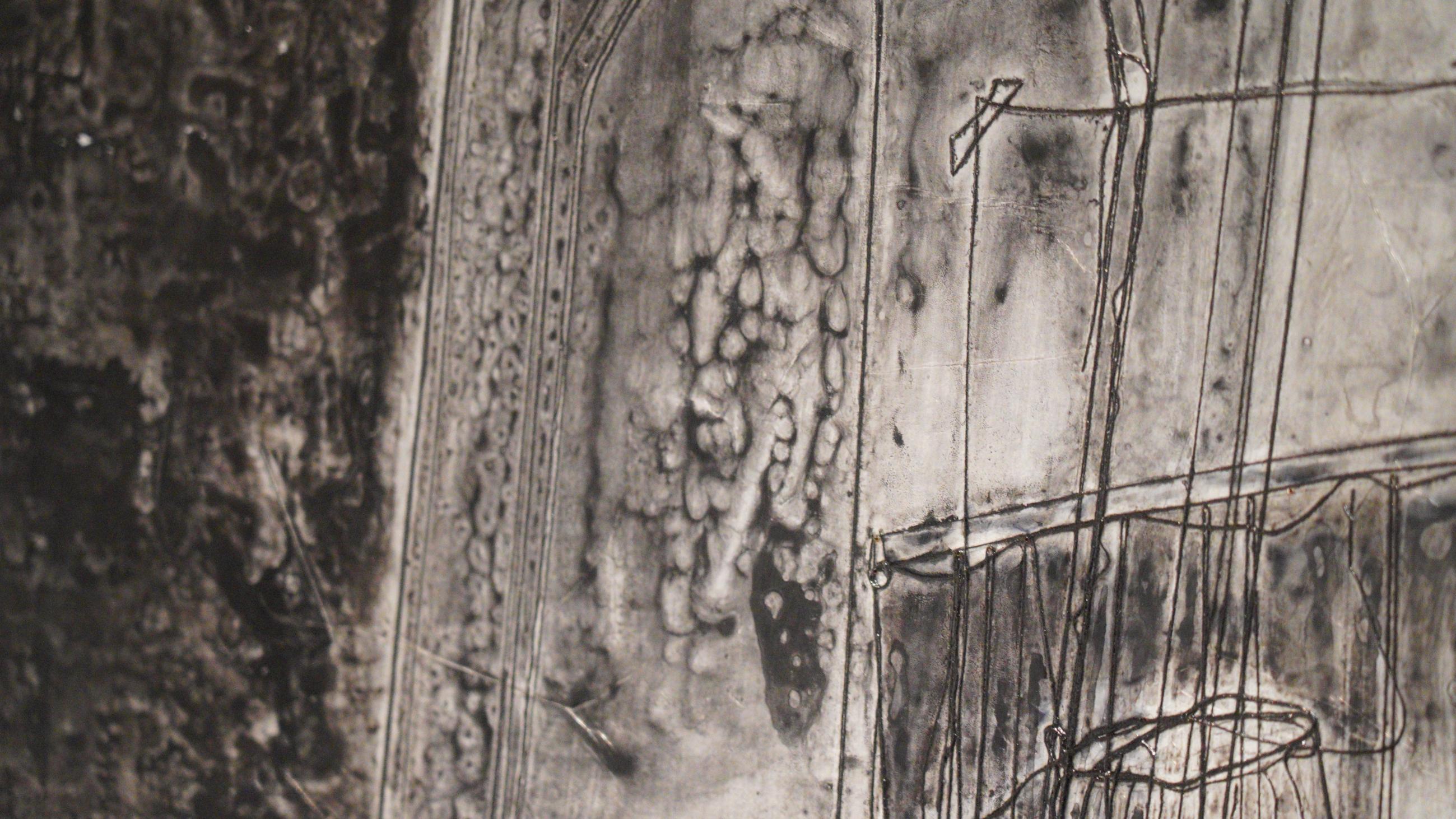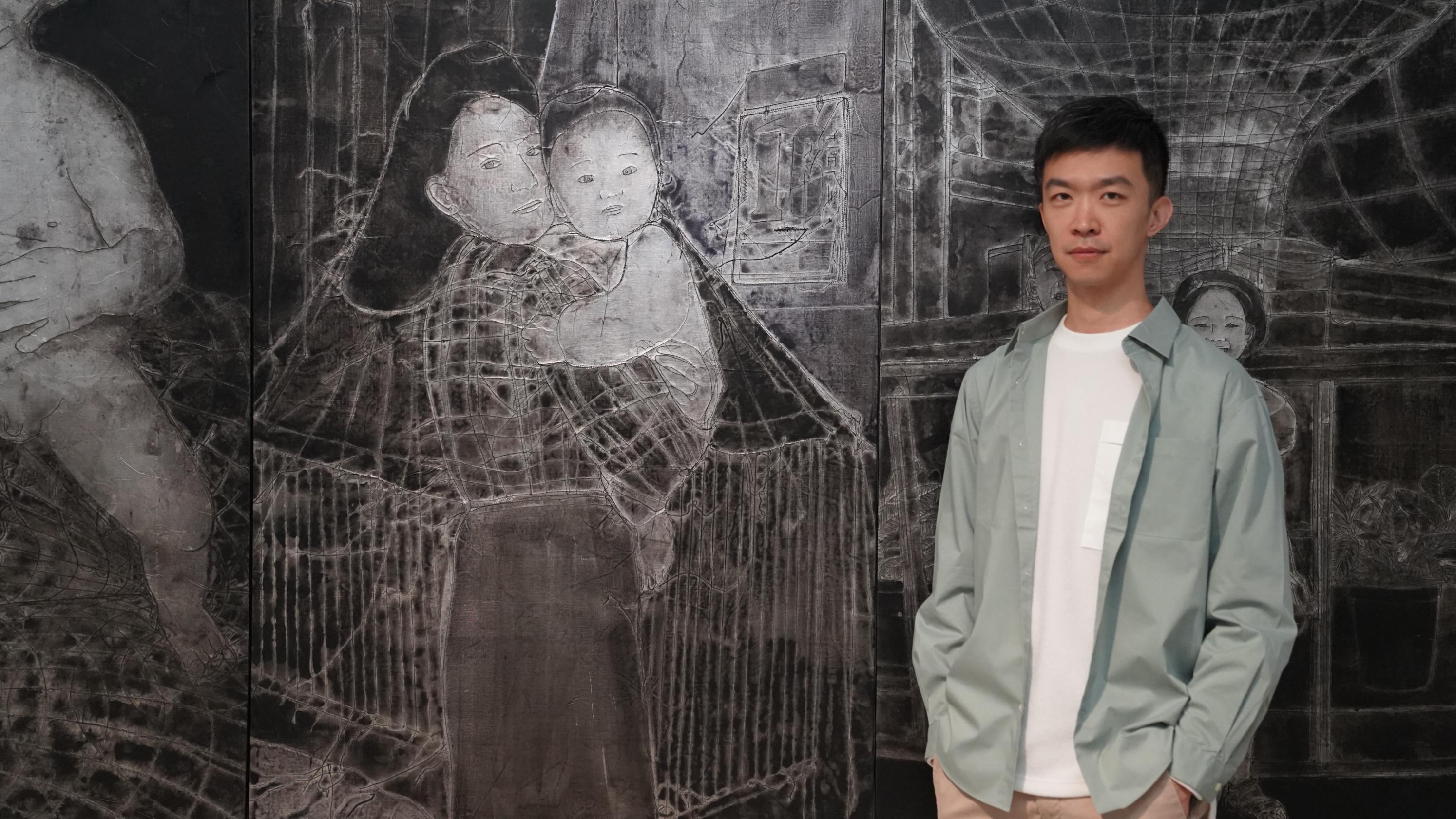 藝術家黃至正描繪家庭與記憶,除了自身家族之外,也放入伴侶的家庭肖像,抽取記憶、重新譜寫,思考當代社會中,鬆動與修補狀態同時發生的非典型家庭關係與多元價值。他將家族合照、日常照片以負片手法呈現,貼上金箔、銀箔,並混用了轉印、車縫、塗抹、刮擦等各式技法,使畫面曖昧不明,如同回憶般難以一眼辨認,卻任誰都可以將自己帶入那似曾相識的觀景窗。「人間喜劇」是黃至正的半虛構家族史,是潮濕記憶的延續,也是人性的探索。