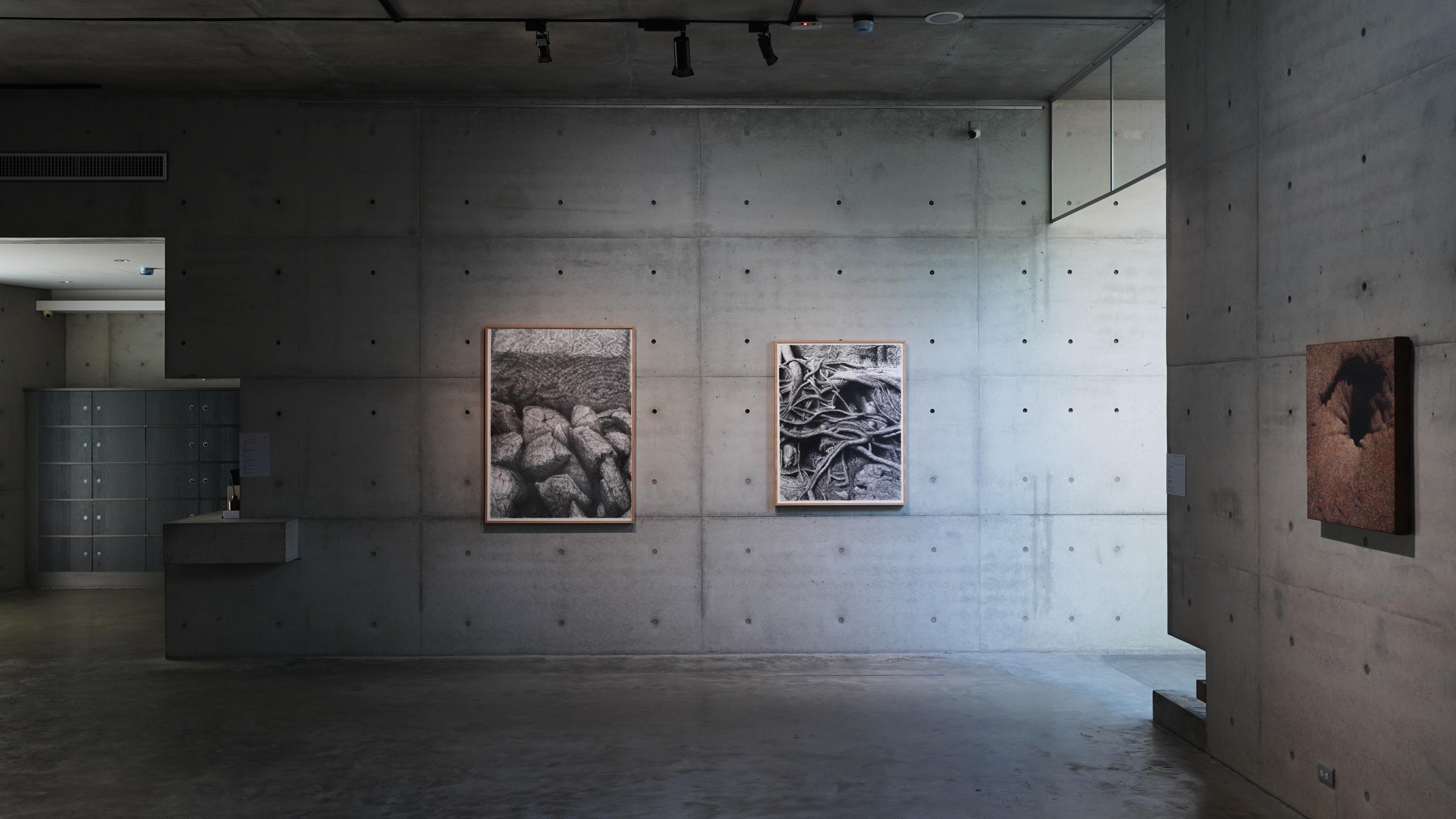 「遊物時間」展場一樓交替並置台灣藝術家周珠旺及羅馬尼亞藝術家丹‧馬諸卡(Dan Măciucă)的畫作,他們同樣將具象風景幻化為抽象隱喻,近觀與遠看皆有不同層次的情感流動。周珠旺喜歡描繪沙石,以「點」的繪畫技法來描繪時間的厚度,仔細畫下每一顆圓潤的點沙,甚至以畫筆讓點的顏料維持錐狀,這樣專注且細膩的重複勞動成為周珠旺對於時間沉積與生命流動的體悟。丹‧馬諸卡(Dan Măciucă)此次展出炭筆風景,作品濃厚的暗色調感染了陰鬱的氛圍,畫作題材皆來自他所拍攝的照片,擷取畫面的抽象結構部分,他將構圖細節重新建構為現實的幻象,藉此突顯風景中的光影動態與表現性。