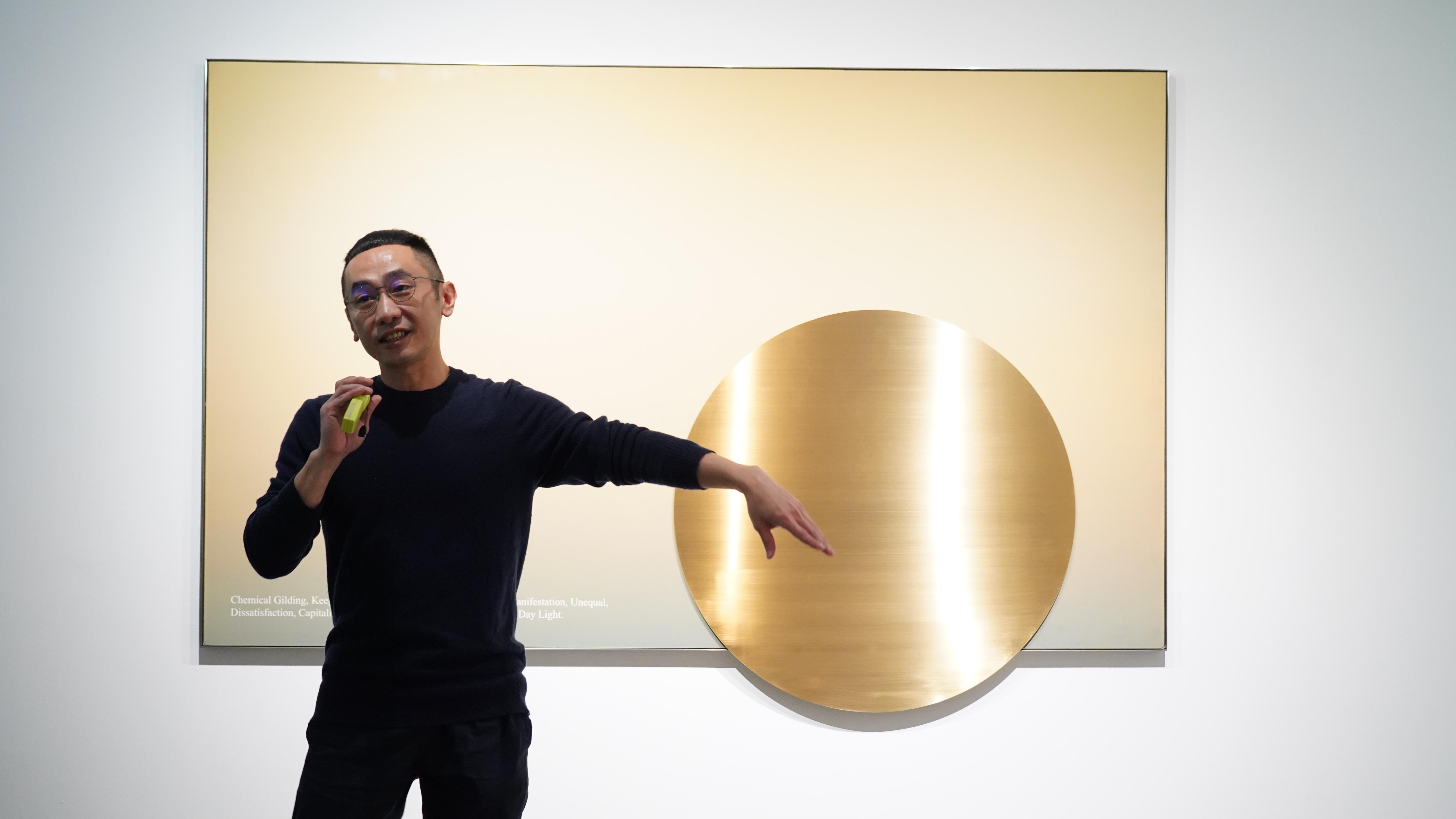 (圖九)台灣藝術家周育正開幕導覽、(圖十)電鍍金,保持冷靜,鍍鋁鋅版,祈禱,漸層,灰燼,抗議,不均,不滿,資本,香爐,佼存,焦慮,擊,日光。 III #1