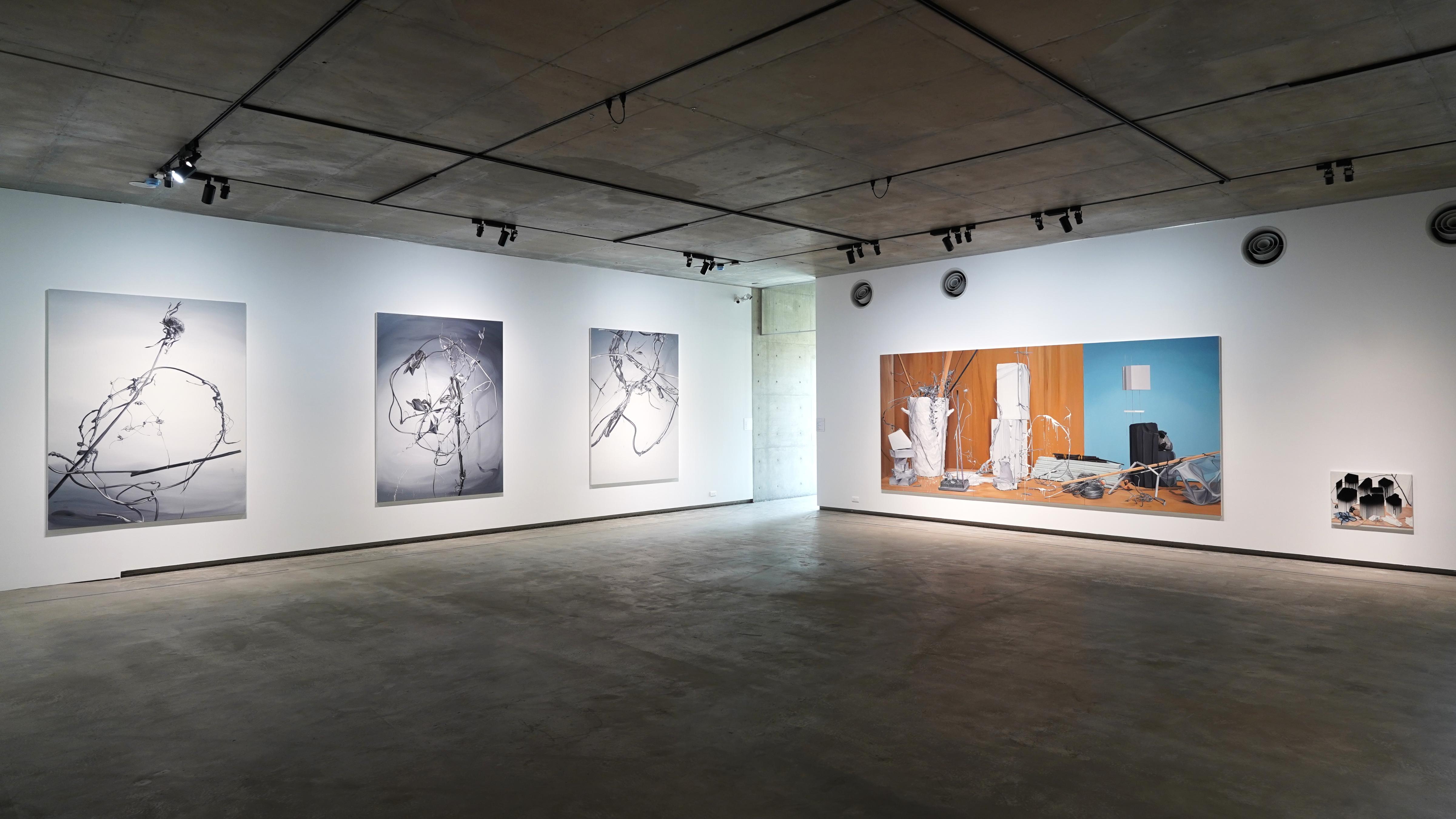 展場二樓韓國藝術家盧恩珠(Rho Eunjoo)與台灣藝術家周育正,他們的作品意象皆傳達出一種似曾相似卻說不出名字、無所不在卻又不像存在的感覺,使「物」的界線更模糊難辨。盧恩珠關注物體與時間、空間、力量和速度等關係,作品畫面中的物件總是呈現難以言喻的某個瞬間,在繪畫之前,她透過製作模型、塗顏料、拍攝等繁複程序,召喚出物件的中性狀態,挑戰觀者既定的感官認知。周育正創作類型多元,透過計畫、出版、裝置、繪畫等不同實踐方法,揭露他所觀察的社會運作型態,此次展出兩系列,各自展現不同的簡練風格,除了匯集日常生活的現象,從而討論藝術造型的形式美學,亦運用長年對於顏料的實驗及獨特耗時的漸層技法,回探自身的情感經驗。