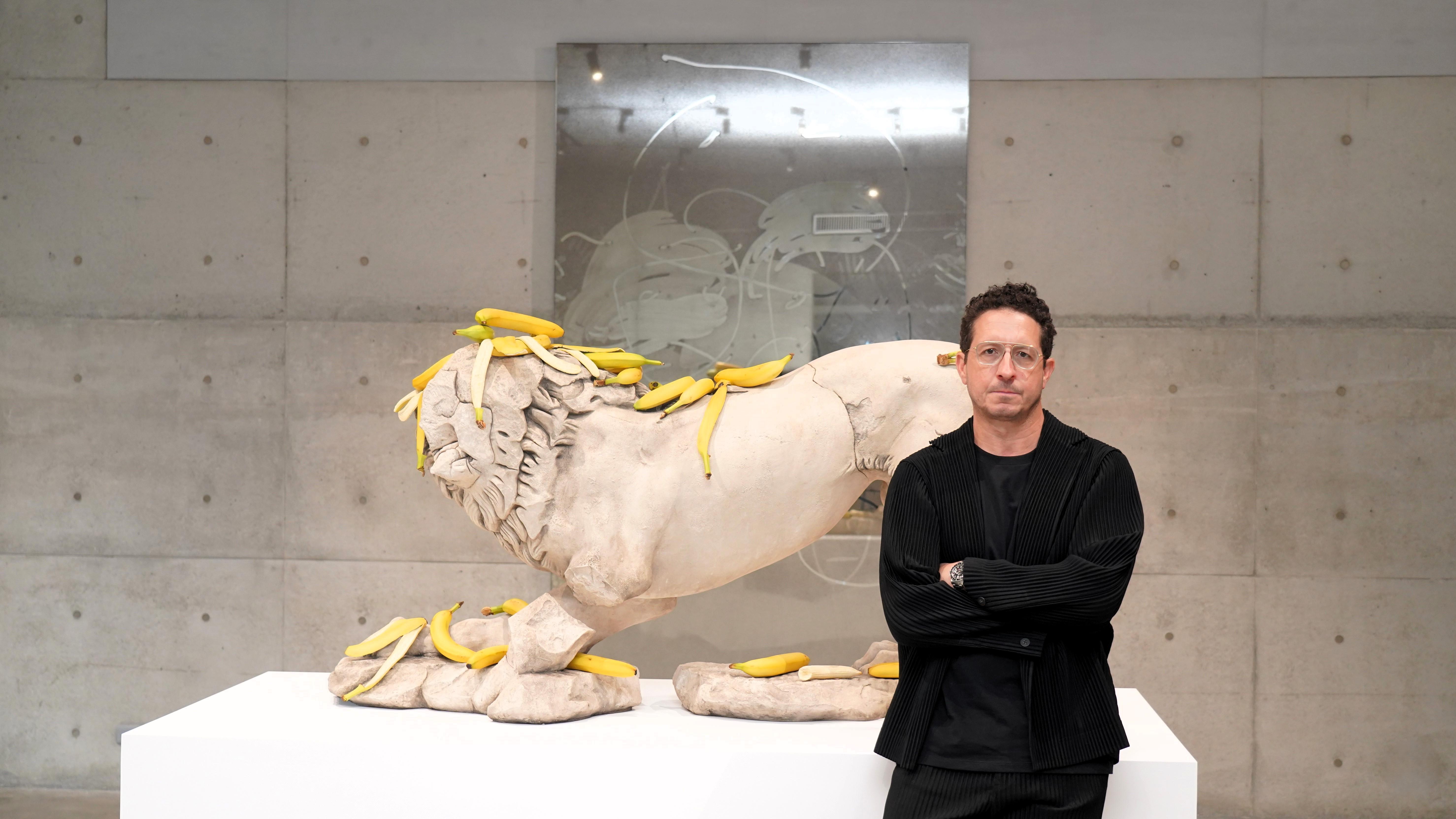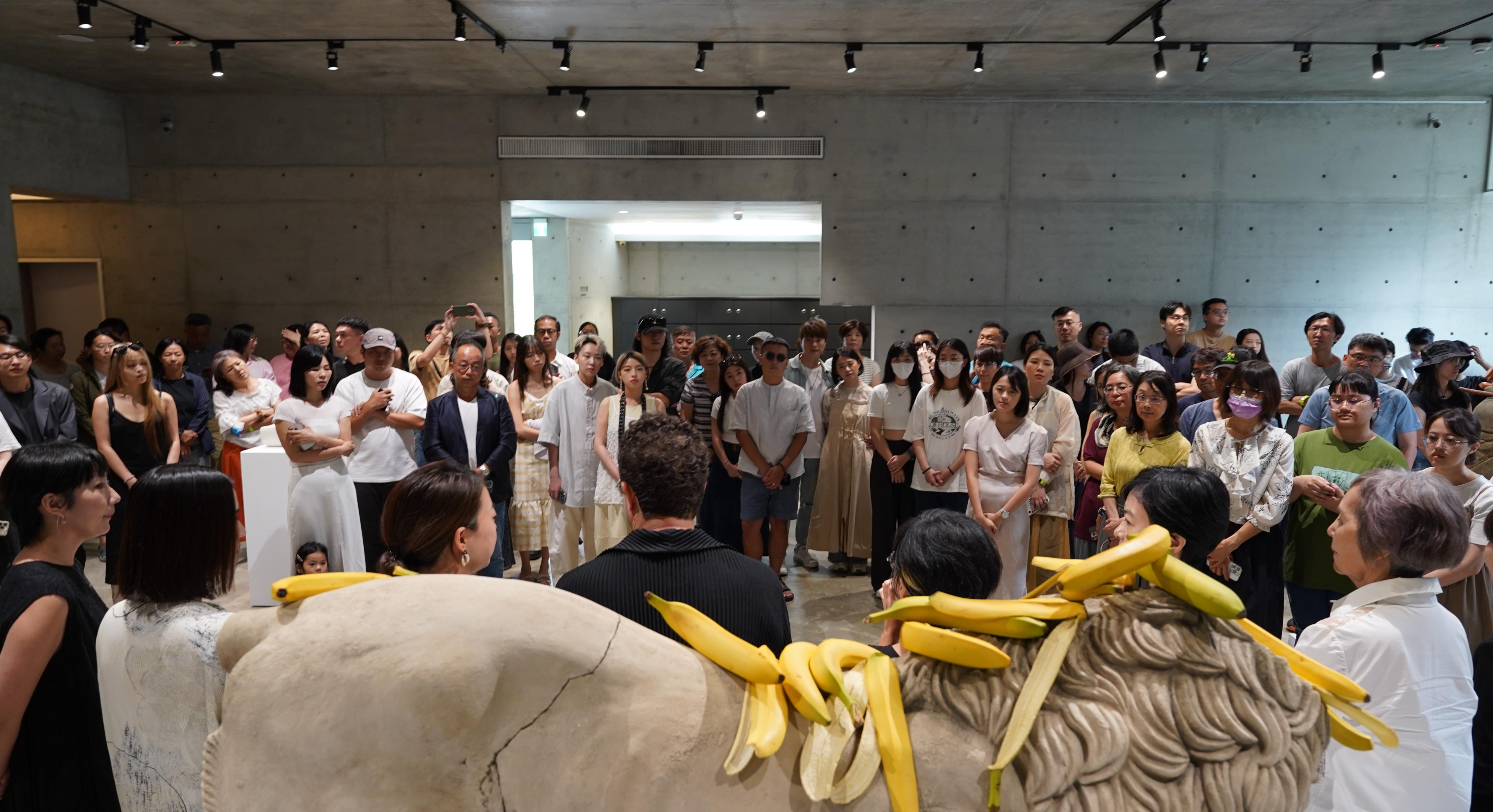 (圖一)美國藝術家托尼‧馬特利與作品獅子(香蕉)、(圖二)「佈局」開幕日藝術家導覽